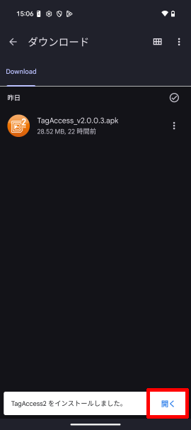 インストール完了直後のメッセージに含まれる[開く]をタップするか、アプリドロワー内の[TagAccess2]のアイコンをタップしてTagAccessを起動します。