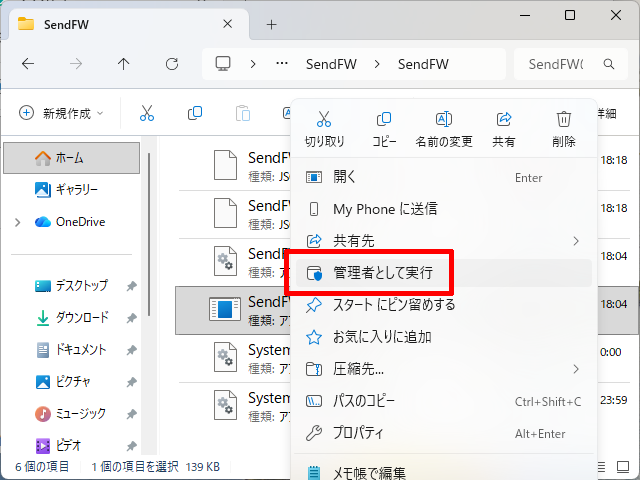解凍(展開)した[SendFW.exe]を右クリックし、メニューから[管理者として起動]します。