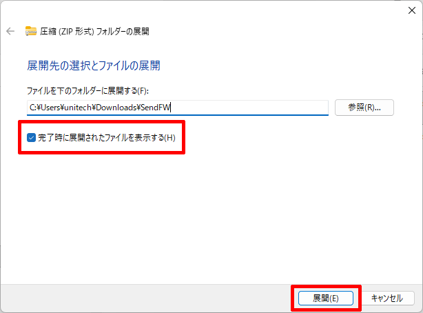 [完了時に展開されたファイルを表示する]にチェックを入れて、[展開]ボタンをクリックします。