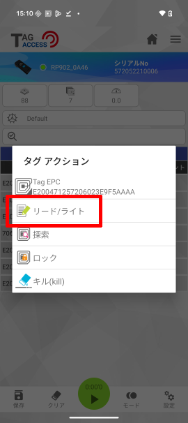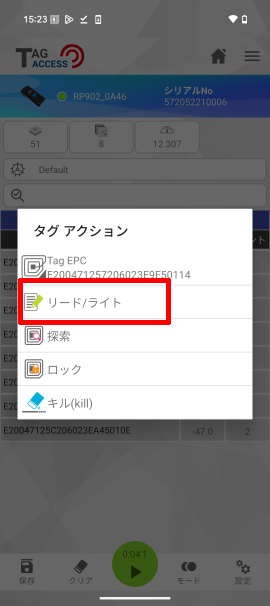 目的のRFIDタグのEPCをリストからロングタップし、タグアクションの[リード/ライト]をタップします。