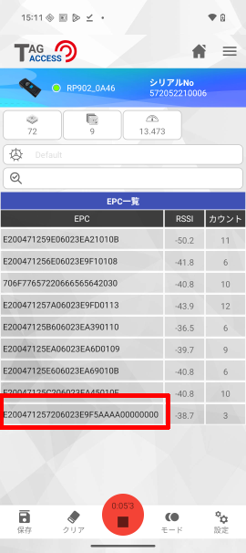 周囲のRFIDタグのEPCメモリ領域を読み取り画面に表示します。