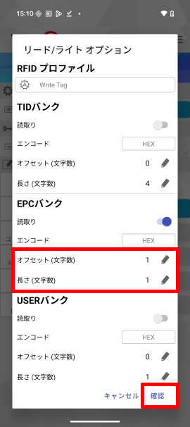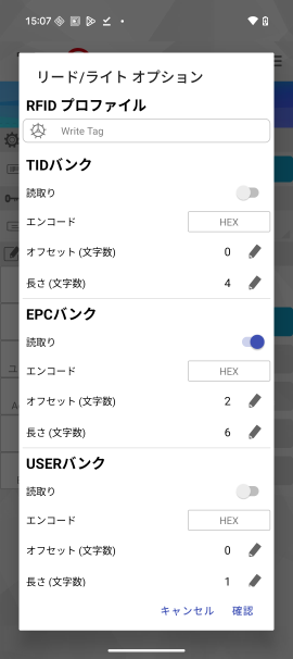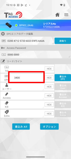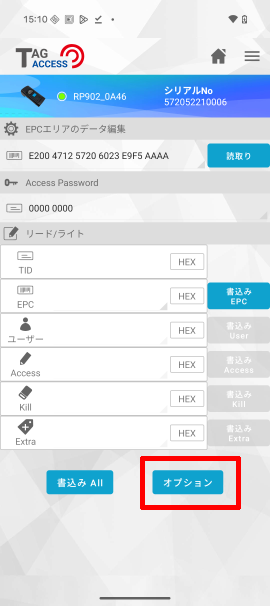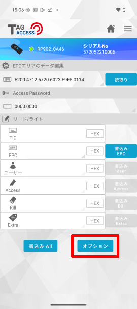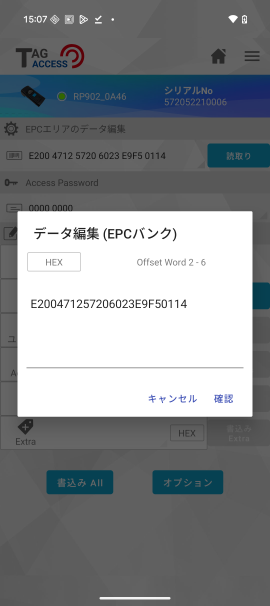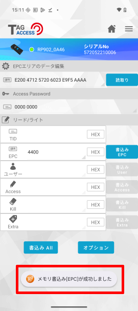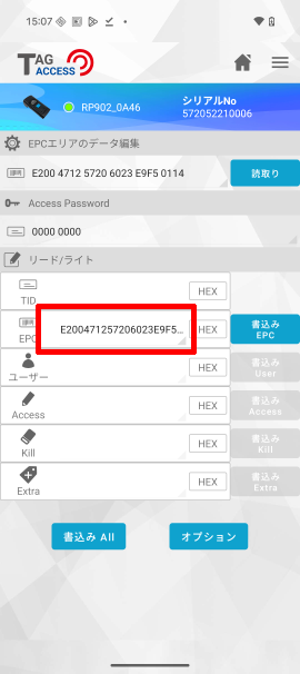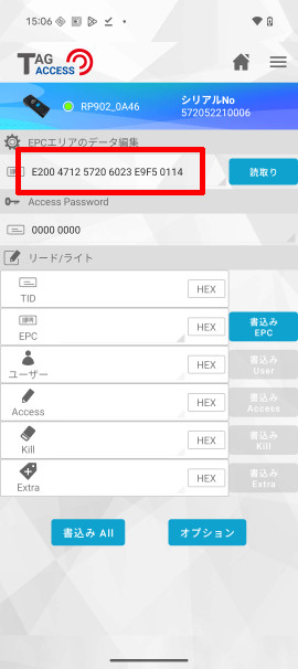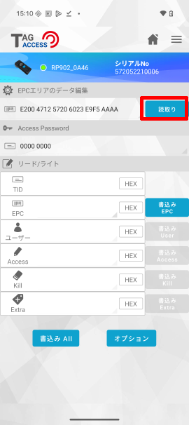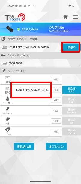 [読取り]ボタンをタップすると、ターゲットのRFIDタグから、オプションパラメータに従い、特定メモリ領域からデータを読み取ります。読み取られたデータは、リード/ライトの項目の該当メモリの場所へ表示されます。この例ではEPCメモリ領域からの読み込みになりますので[EPC]に表示されています。