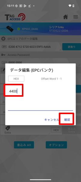 データの編集ウィンドウが表示されます。希望するデータに変更して[確認]ボタンをタップして確定します。ここでは、8ワードの読み込みに変更するため4400を入力します。