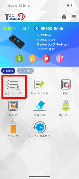 []→[インベントリ]→[ ]をタップしてインベントリを開始します。