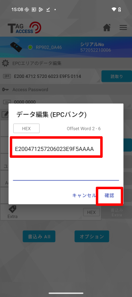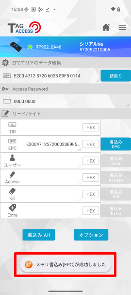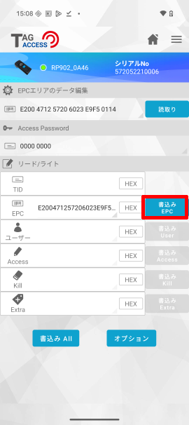 上書きしたいメモリ領域のボタンをタップして書き込みを開始します。この例ではEPCメモリ領域に書込むため[書込みEPC]ボタンをタップします。