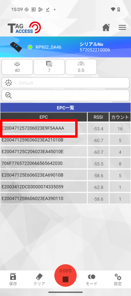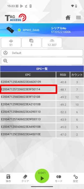 インベントリ操作によって読み取れたEPCデータのリストから、目的のRFIDタグのEPCデータをロングタッチします。