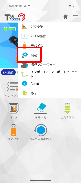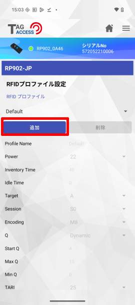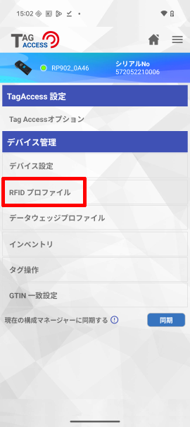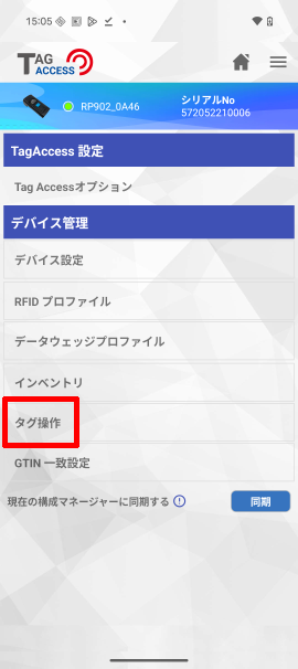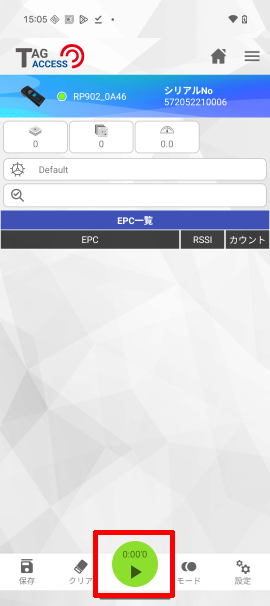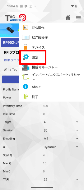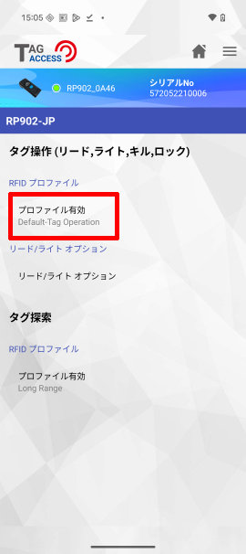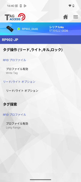 TagAccess2 for Androidを起動し、RP902またはRP902 MFiと接続します。(このページではTagAccess2のインストール方法、起動方法、接続方法については説明しておりません。)