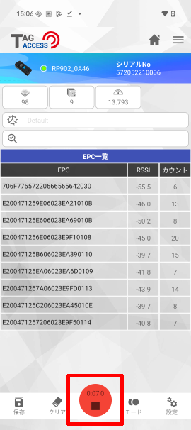 インベントリ操作で目的となるRFIDタグを読み取ったら、[ ]をタップしてインベントリによる読み取りを終了します。