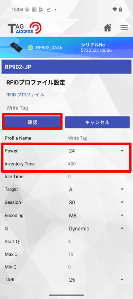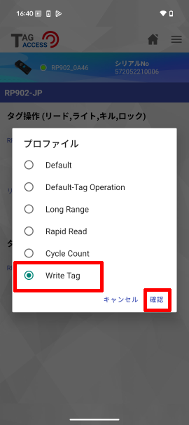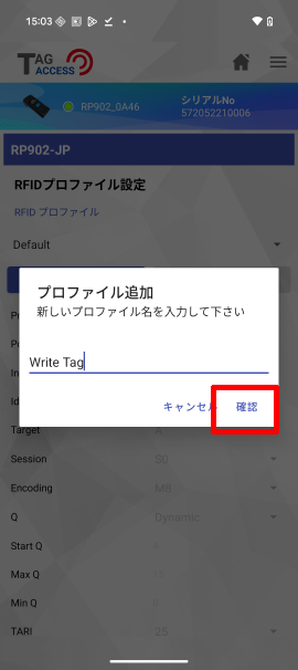 新しいプロファイル名(例では「Write Tag」としています)を入力し、[確認]ボタンをタップします。