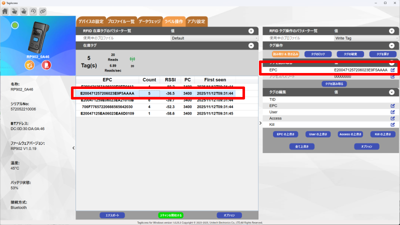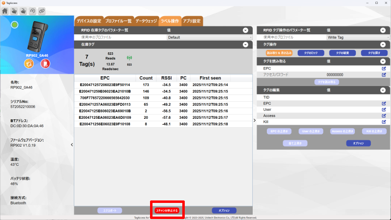 [ラベル操作]タブへ移動し[スキャンを開始]ボタンをクリックして目的のRFIDタグを読み取り、[スキャンを停止]ボタンをクリックしてインベントリ操作を終了します。