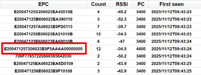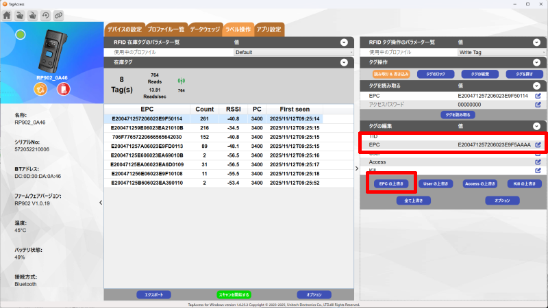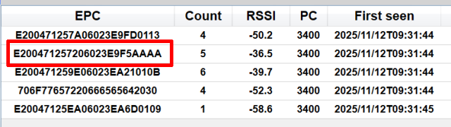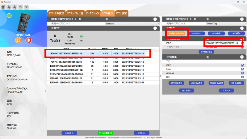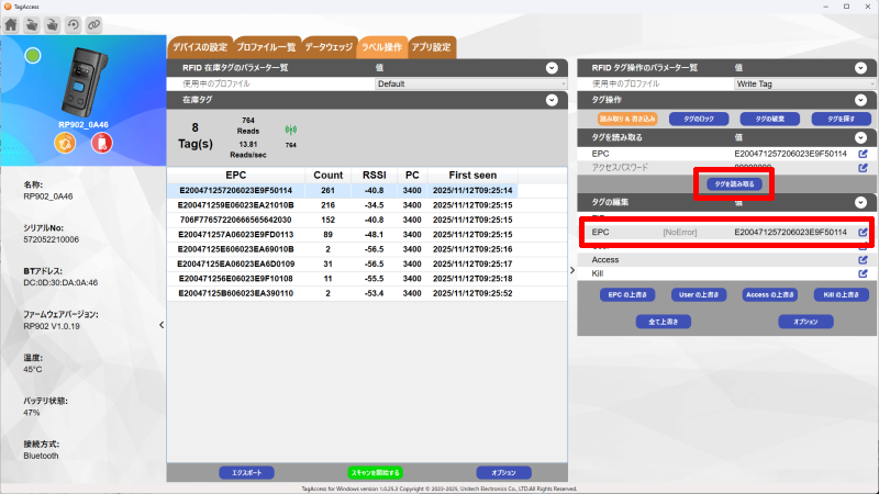 周囲のRFIDタグのEPCメモリ領域を読み取り画面に表示します。