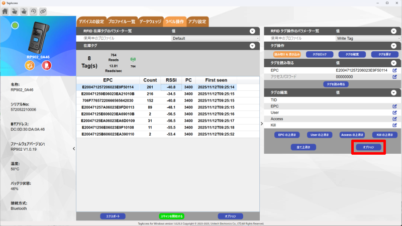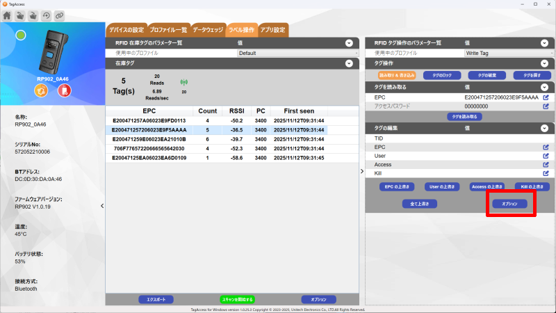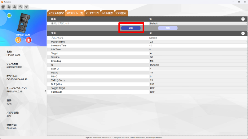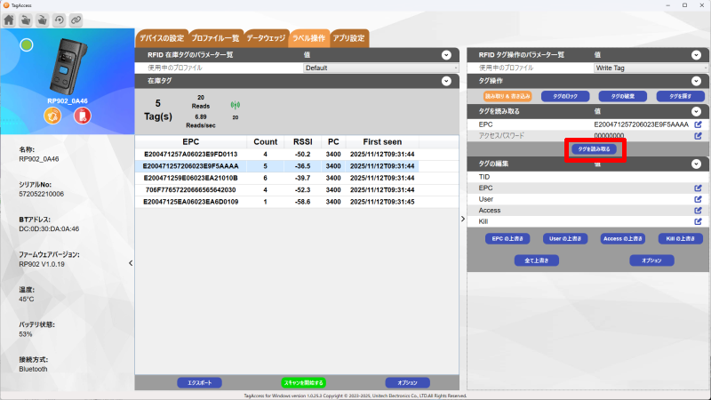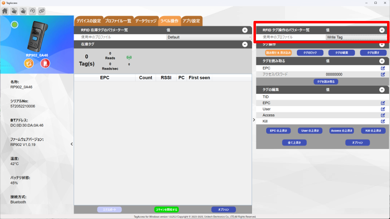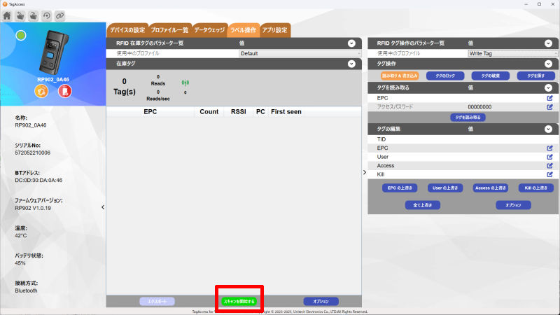 TagAccess for Windowsを起動し、RP902またはRP902 MFiと接続します。(このページでは接続方法については説明しておりません。)