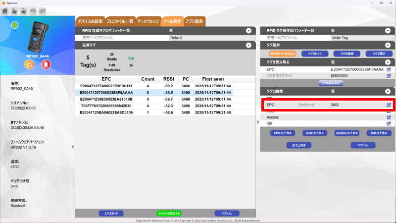 左側ウィンドウの[スキャンを開始する]ボタンをクリックしてインベントリを開始し、読み取りデータ長が拡張されていることを確認します。以降、拡張されたEPCデータに対して読み取りや書き込みを行うことができます。