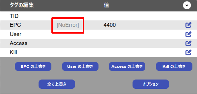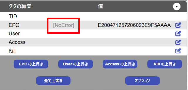 書き込みが成功すれば[NoError]が表示されます。[NoTagReply]や、[UnknowError]の場合は、書き込みに失敗しています。