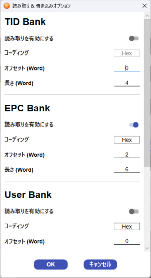 ここで、読み取りおよび書き込みする、メモリ領域の指定や読み取り、書き込み位置を指定します。このページの操作例ではデフォルトのまま、EPCメモリ領域の読み取りと書き込み操作をおこないますので[キャンセル]ボタンをクリックして閉じてください。