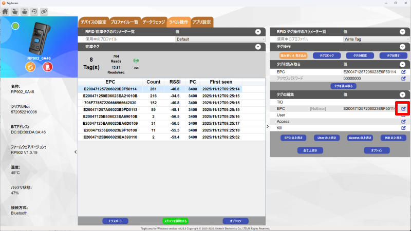 右側ウィンドウの[タグを読み取る]ボタンをクリックすると、ターゲットのRFIDタグから、オプションパラメータに従い、特定メモリ領域からデータを読み取ります。読み取られたデータは、[タグの編集]の項目の該当メモリの場所へ表示されます。この例ではEPCメモリ領域からの読み込みになりますので[EPC]に表示されています。