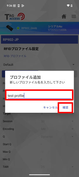 新しいプロファイル名(例では「test profile」としています)を入力し、[確認]ボタンをタップします。