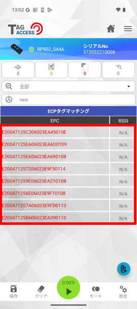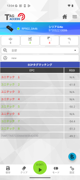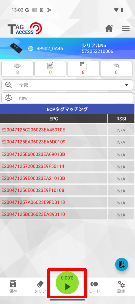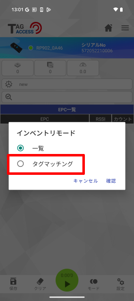 TagAccess2を起動し、[インベントリ]→[モード]→[タグマッチング]→[確認]をタップして、「タグマッチング」モードに切り替えます。