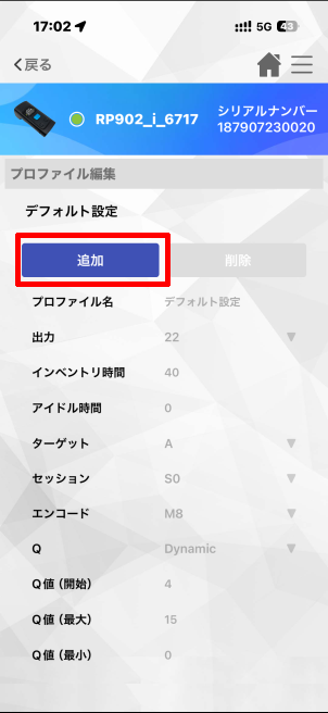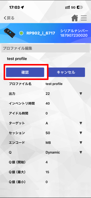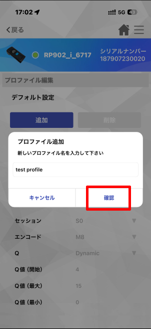 新しいプロファイル名(例では「test profile」としています)を入力し、[確認]ボタンをタップします。