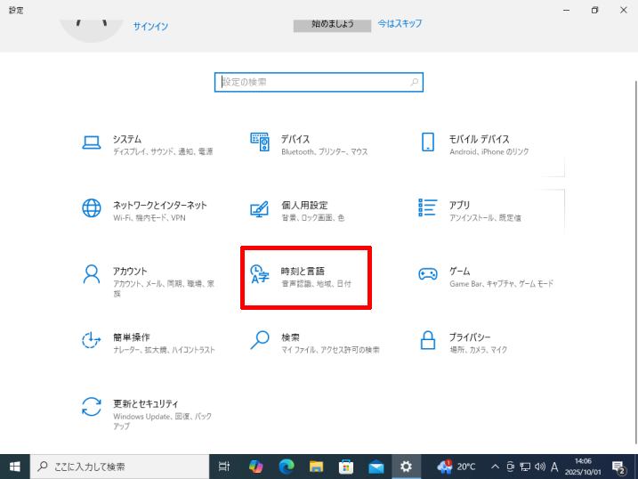 [ スタート]→[ 設定]→[時刻と言語]をクリックします。