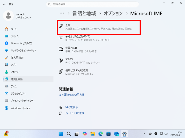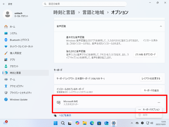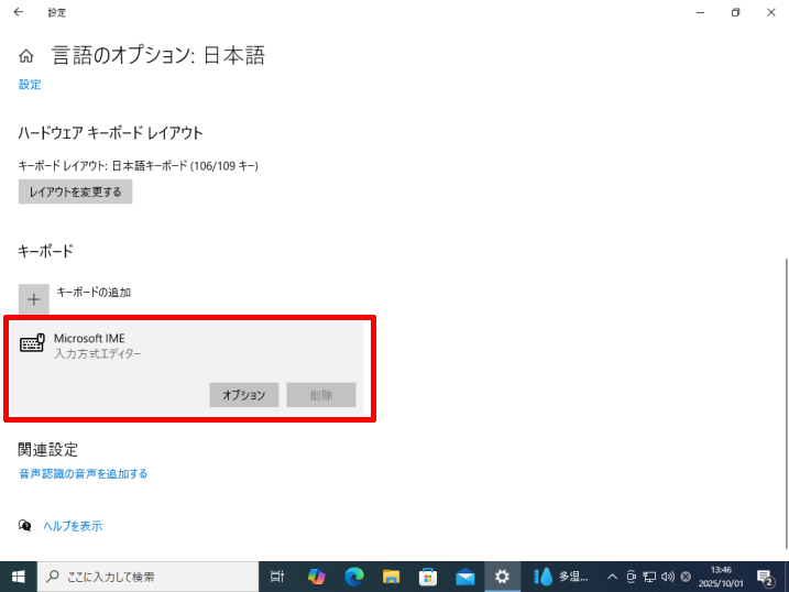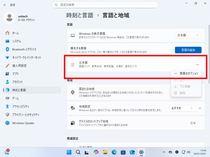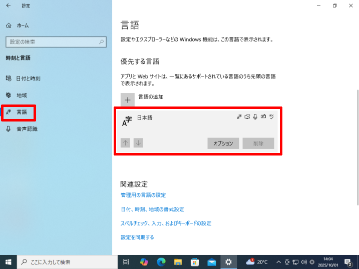 [言語]→優先する言語の[日本語]→[オプション]をクリックします。