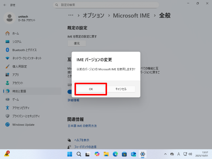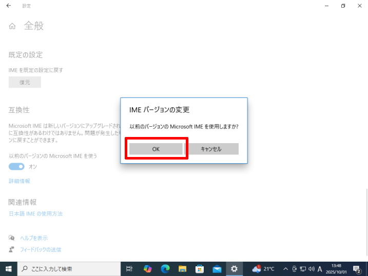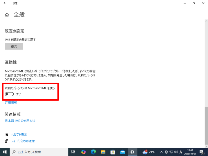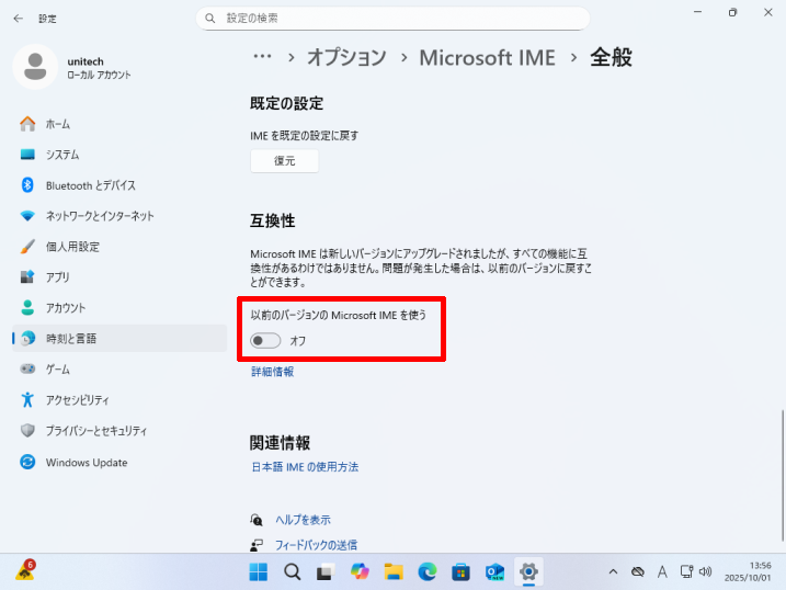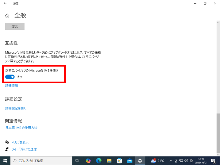 [以前のバージョンのMicrosoft IMEを使う]のスイッチがオンになっていることを確認してください。