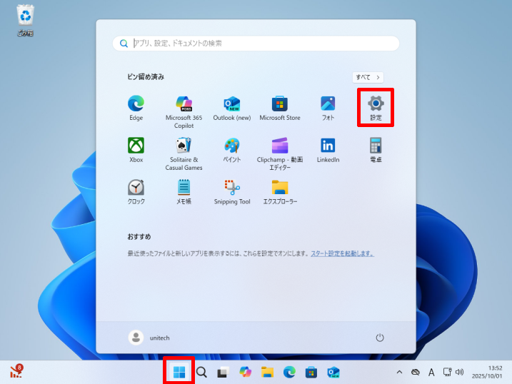 [ スタート]→[ 設定]をクリックします。