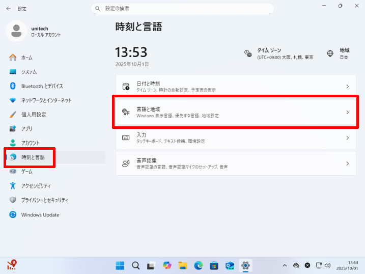 [時刻と言語]→[言語と地域]をクリックします。