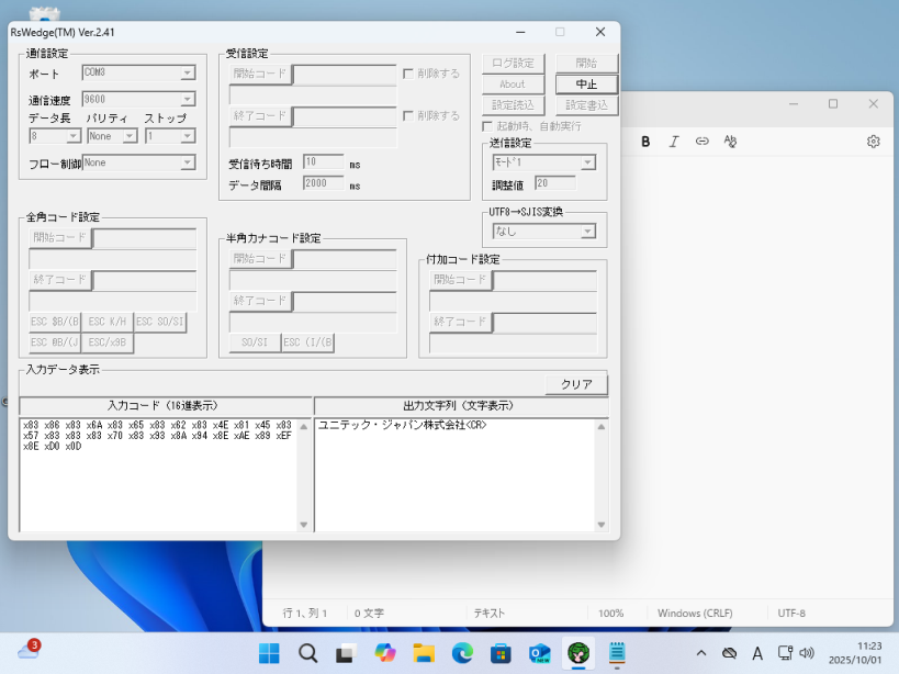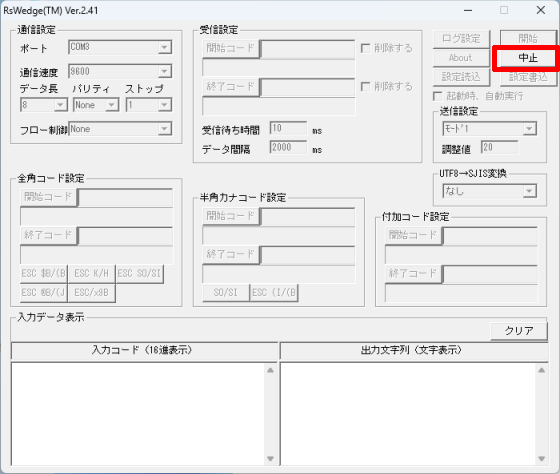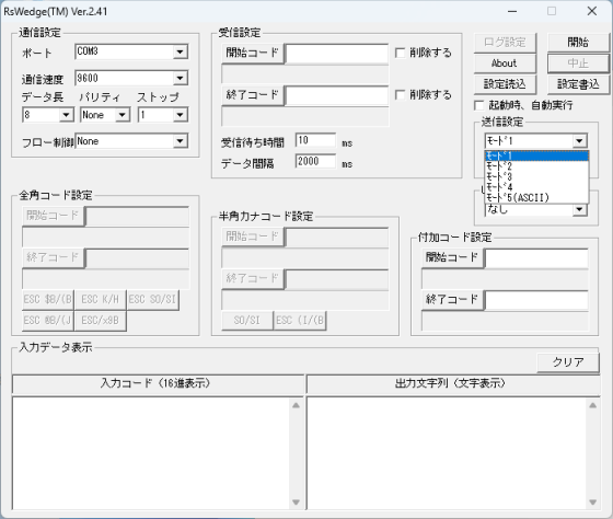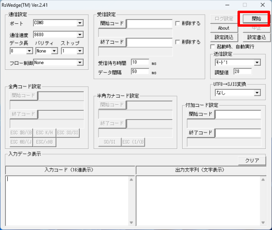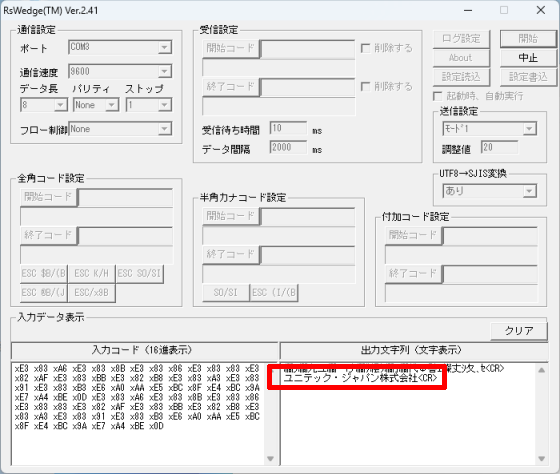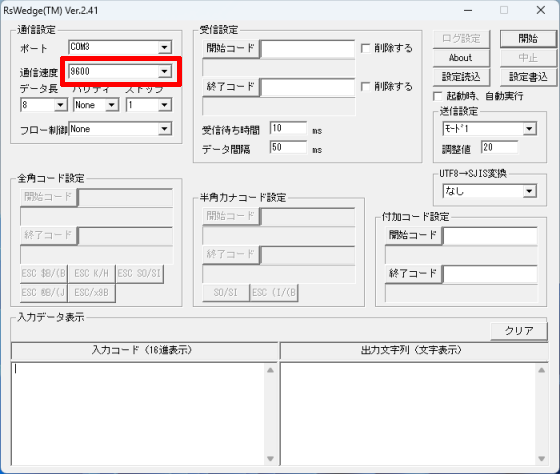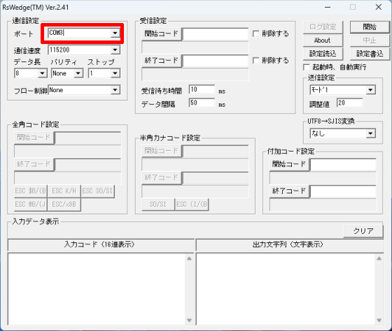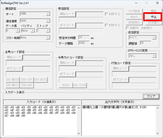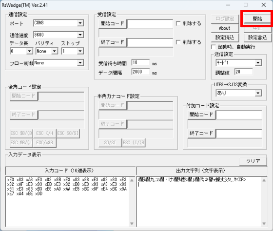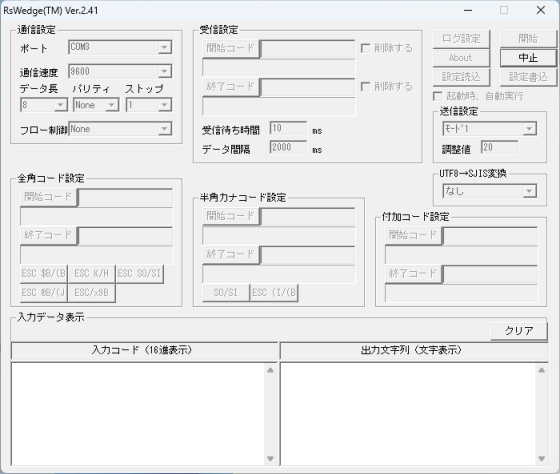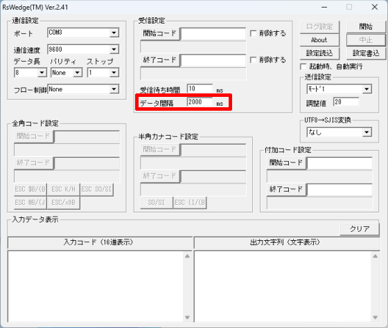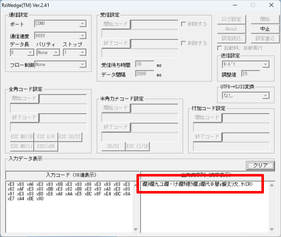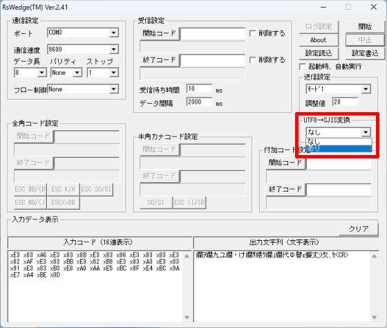 次の画像のように、RSWedgeの[入力データ表示]内でも全角文字が文字化けしてしまう場合、[UTF8→SJIS変換]を別の値に変更してください。