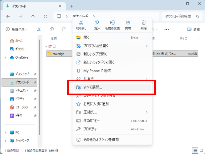 ダウンロードしたzipファイルを右クリックして[すべて展開]するか、zip解凍ソフトウェアを使用して解凍(展開)してください。