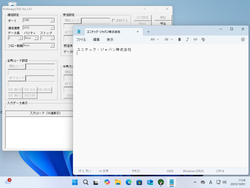 以降、RSWedgeの画面が最前面にある場合は自身の[入力データ表示]の左右の両方のボックスに読み取ったデータを表示し、他のソフトウェアが最前面にある場合はそのソフトウェアに読み取ったデータを入力します。