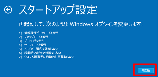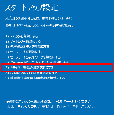 Windowsは、ドライバー署名の強制を無効化した状態で起動します。その後OSを再起動すると元の状態に戻ります。