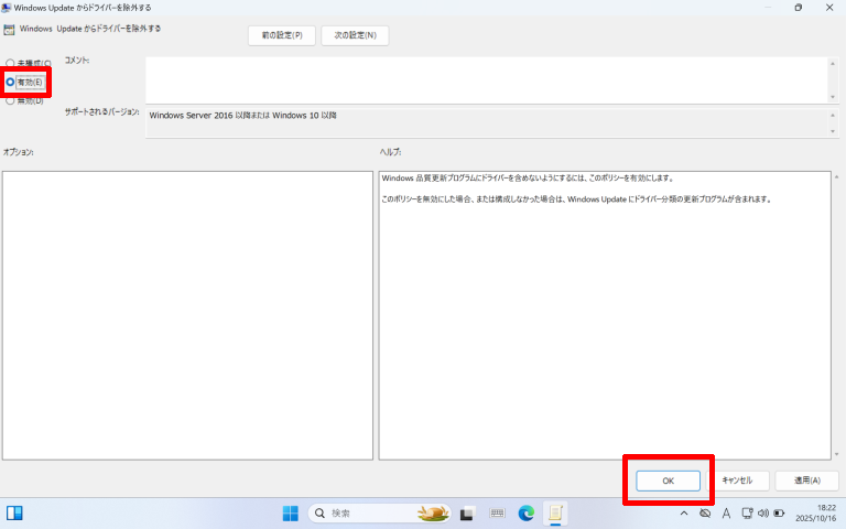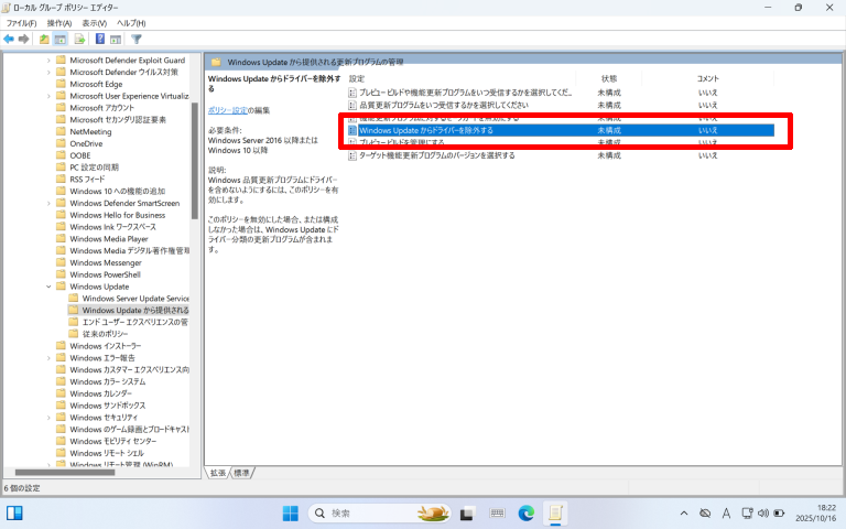 [コンピューターの構成]→[管理用テンプレート]→[Windows コンポーネント]→[Windows Update]→[Windows Update から提供される更新プログラムの管理]に移動し、[Windows Update からドライバーを除外する]をダブルタップして開きます。