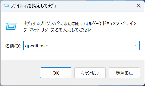 キーボードの[ Windows]キーを押しながら[R]キーを押して[ファイル名を指定して実行]ダイアログを開きます。入力欄に[gpedit.msc]と入力し、OKボタンをクリックして[グループポリシーエディター]を開きます。