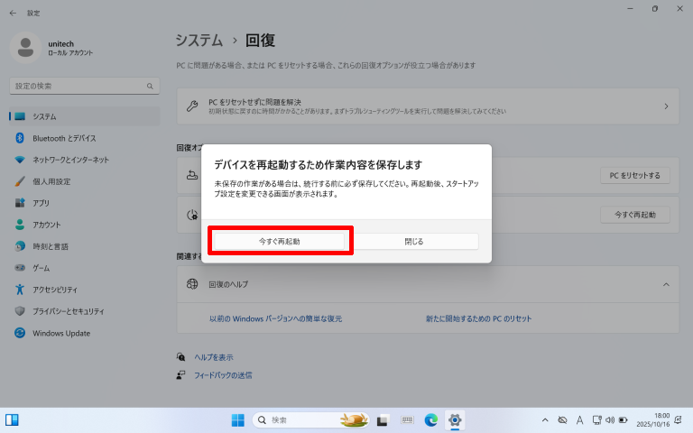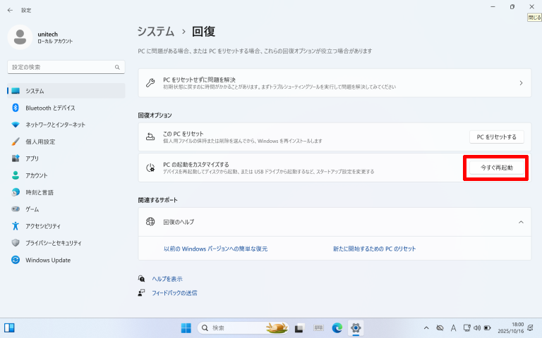 [PCの起動をカスタマイズする]の項目にある[今すぐ再起動]ボタンをタップします。