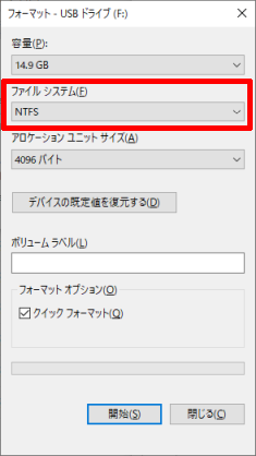 16GB以上の容量を持つUSBフラッシュメモリを[NTFS]ファイルシステムでフォーマットまたはクイックフォーマットします。