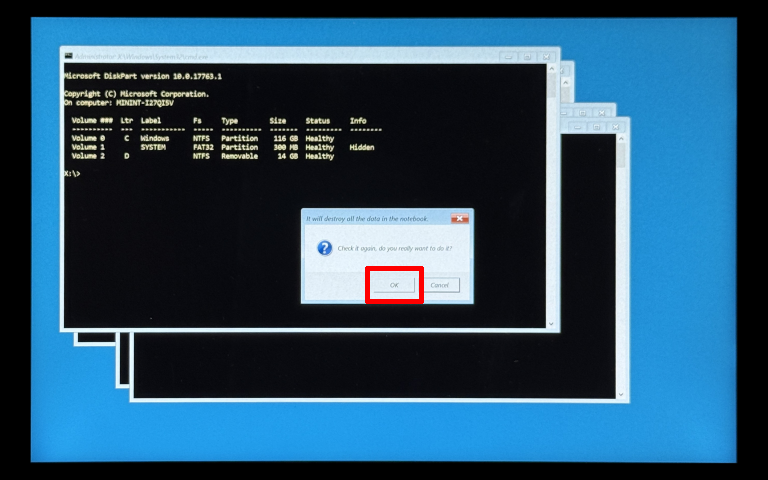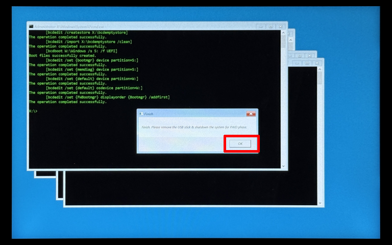 [Finish. Please remove the USB stick & shutdown the system for PAID phase.]のメッセージが表示されたら、USBメモリスティックを取り外し、[OK]ボタンをタップまたはクリックします。
