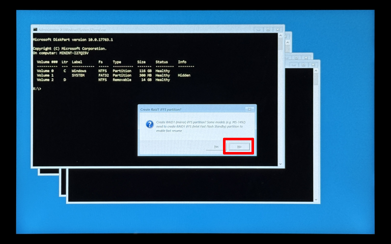 [Create RAID 1 (mirror) iFFS partition? Some ...]のメッセージが表示されたら、[No]ボタンをタップまたはクリックします。