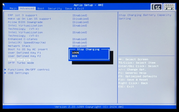 BIOS画面が表示されたら、[Advanced]→[Stop Charging]を[80%]に設定します。